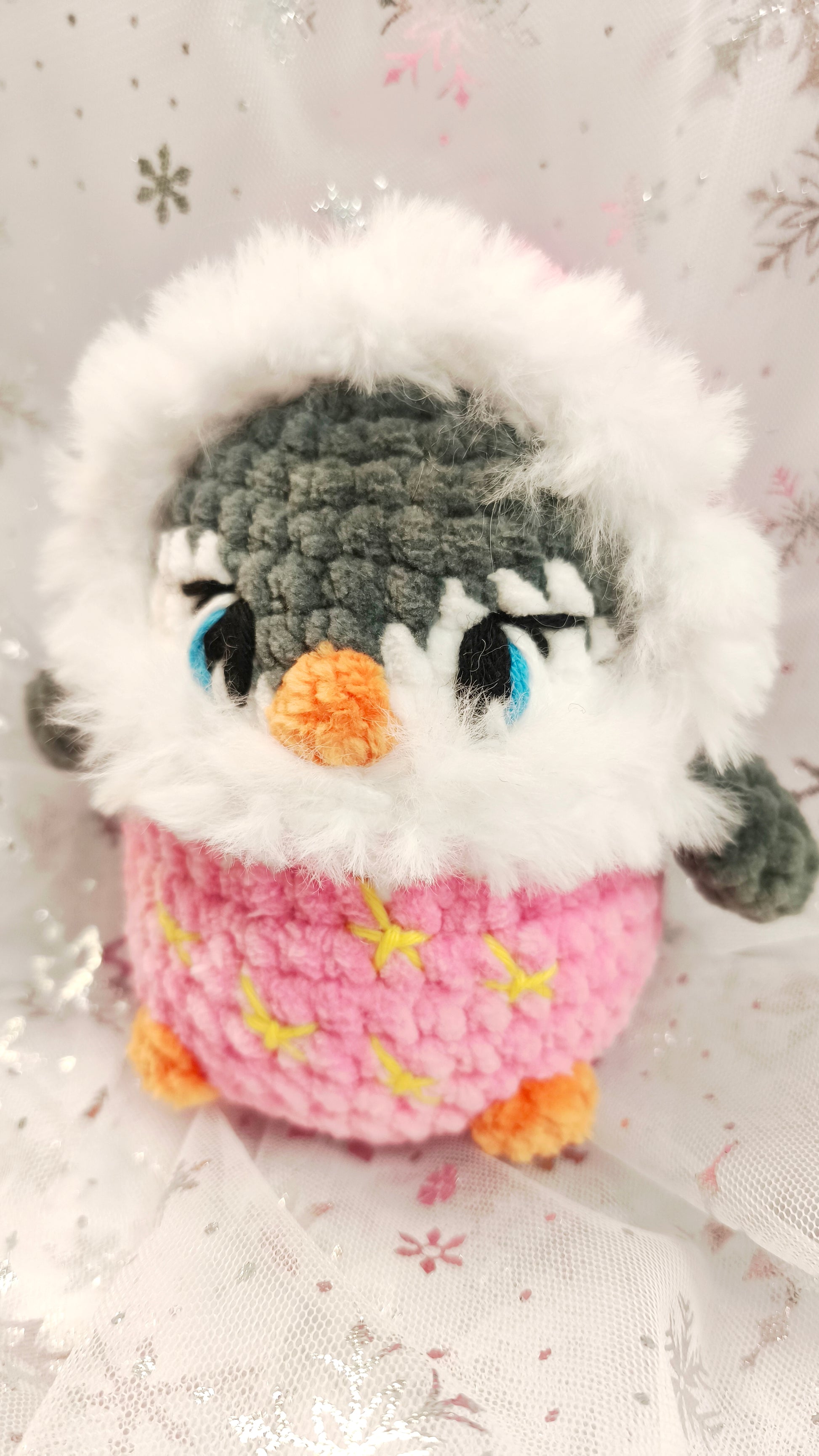 Dieser kleine Pinguin aus meiner Winter Moon & Stars Collection wurde in liebevoller Handarbeit gehäkelt und trägt einen kuschelig weichen Winterhoodie mit zarten aufgestickten Sternen. Seine großen blauen Augen, die flauschige Kapuze und sein runder, weicher Körper machen ihn zu einem besonders sanften Begleiter, ideal zum Verschenken oder zum Sammeln. Jeder Pinguin entsteht in sorgfältiger Einzelarbeit und hat seine ganz eigenen Farbakzente.