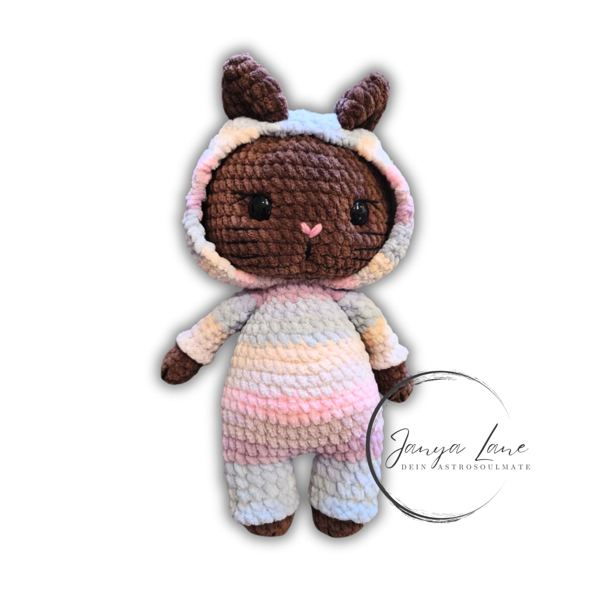 Mit ihrem pastellfarbenen Onesie in sanften Regenbogentönen und ihrem weichen dunkelbraunen Fell ist sie ein fröhlicher und zugleich beruhigender Begleiter. Mit ca. 30 cm Größe ist sie perfekt zum Schmusen, Spielen oder als besonderes Geschenk.