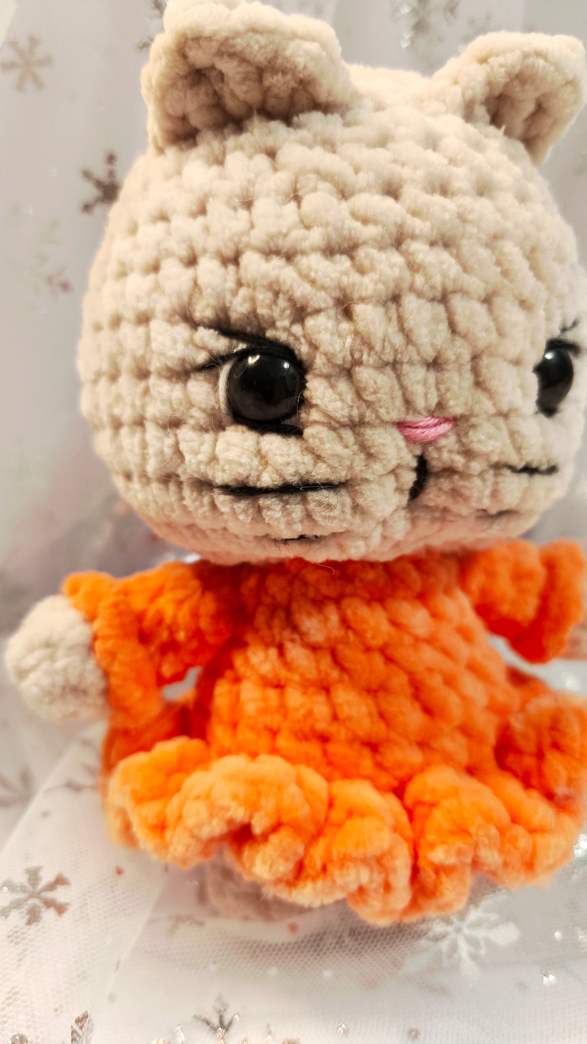 Die kleine Katze „Peata“ ist ein liebevoll gehäkeltes Unikat mit einem süßen apricotfarbenen Kleidchen, das beim Anschauen sofort ein warmes Lächeln hervorruft. Ihr weicher Körper, die großen glänzenden Augen und die kleinen Pfötchen machen sie zu einem ganz besonderen Herzensstück. 🧡